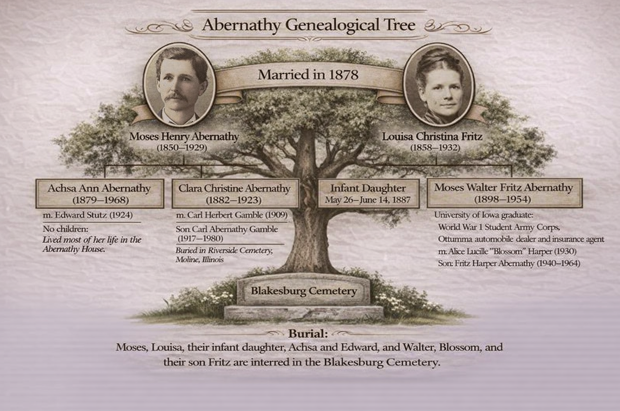 In 1892 Moses’s Queen Anne-style residence symbolized his prosperity and the broader optimism of the late nineteenth century. Today, the Abernathy House preserves the story of Moses and Louisa Abernathy—a partnership whose enterprise, leadership, and commitment to family and community left a lasting mark on the history of Blakesburg.